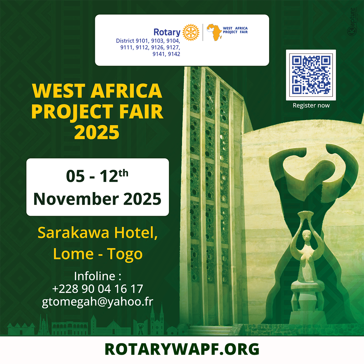 Registration Sign up now By completing the form below to participate in this year’s exhibition, you will receive an email with instructions on how to proceed with the payment. WAPF Registration Form Email invalide..! Type of Participation : Select the type of participation West Africa participant club International Partner Visiting Rotarian Guest West African Participating Club Offer to : 350$ - In-person participation Select a country International Partnership Offer to : 175$ - In-person participation Select a country Submit All fields are mandatory